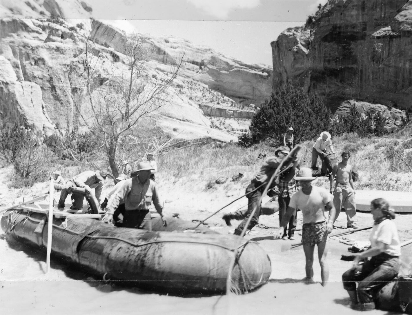 1953 Sierra Club Green River Canyon Trip. Sierra Club members beach the 13-ton inflatable pontoon boat/ raft at Dinosaur National Monument's Bull Park.