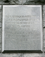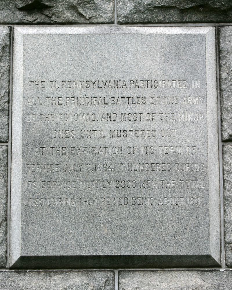 1 of 110 MN to PA. Dedicated 07/03/1886. Indicates position 71st PA Infty held 07/03/1863 at the Angle. Wall breached, LF & center retired to RF position. Located at Angle off Webb Rd. LF 114' S of MN. || Mn & 2 Flank Markers. Mn: fdn 6'1" sq, battered shaft, rough-cut/laid blocks, w/ polished tablets, bronze medallion. Cap cross gable, trefoil. Incised/excised inscrip/detailing. All 10'1"H. Markers: 1'sq x1'6"H. Cleaned, 1985-1987, tablet stained.