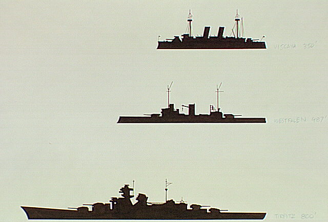 Split panel showing silhouettes of the Spanish Cruiser "Viscaya" (top), the German Battleship "Westfalen" (middle), and the German Battleship "Tirpitz" (bottom).