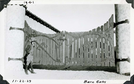 C. A. MacNeilledge standing in front of ornate gates to western entrance of Scotty’s Castle Stables. November 22, 1929. Photographed by Mat Roy Thompson. MacNeilledge is the designer for the 2nd construction period. Inscription in black ink, bottom right: Barn Gates. In black ink, bottom left: 11-22-29. Number in black ink at top left refers to historic photograph numbering system: 1941. Black and white, horizontal format, 3 x 5 inch. Corner mounted on photograph album page.