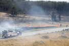 The prescribed fire moves away from Crawford Avenue. There is a fire truck in the road and four fire fighters monitor the area. The fire is moving away from the road.