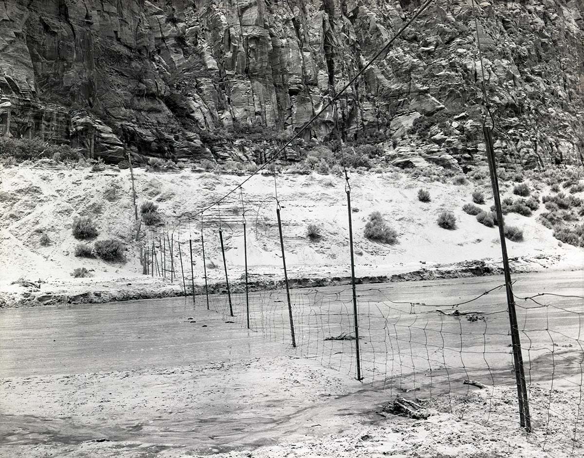 East boundary fence during flood, Parunuweap Canyon. ; ZION Museum and Archives Image 005_02_005 ; ZION 10294