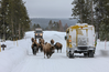 Snowcoaches stopped for bison in Lower Geyser Basin;