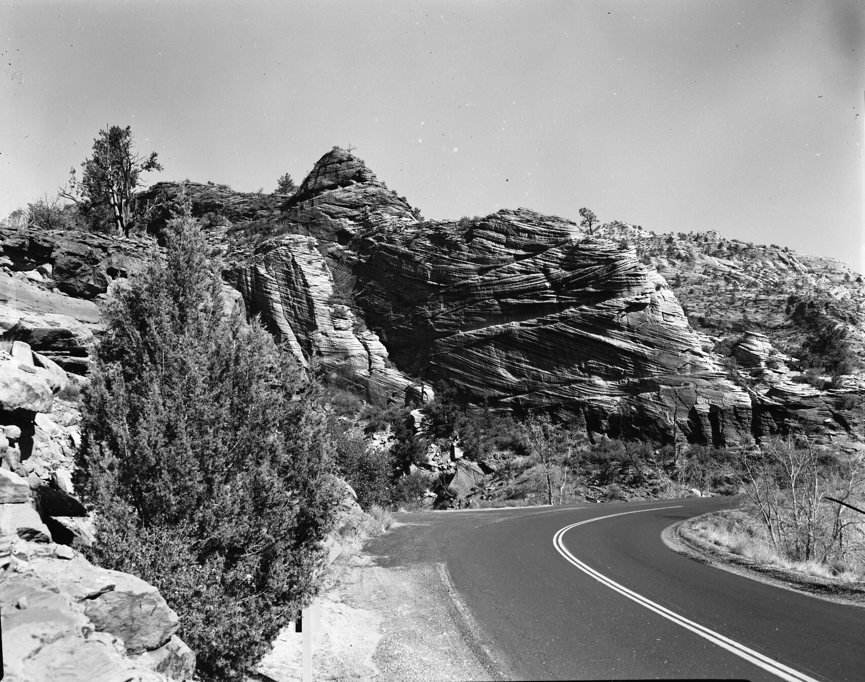 Cross bedding planes in the Navajo sandstone along East Entrance road. ; ZION Museum and Archives Image ZION 9900 ; ZION 15933