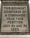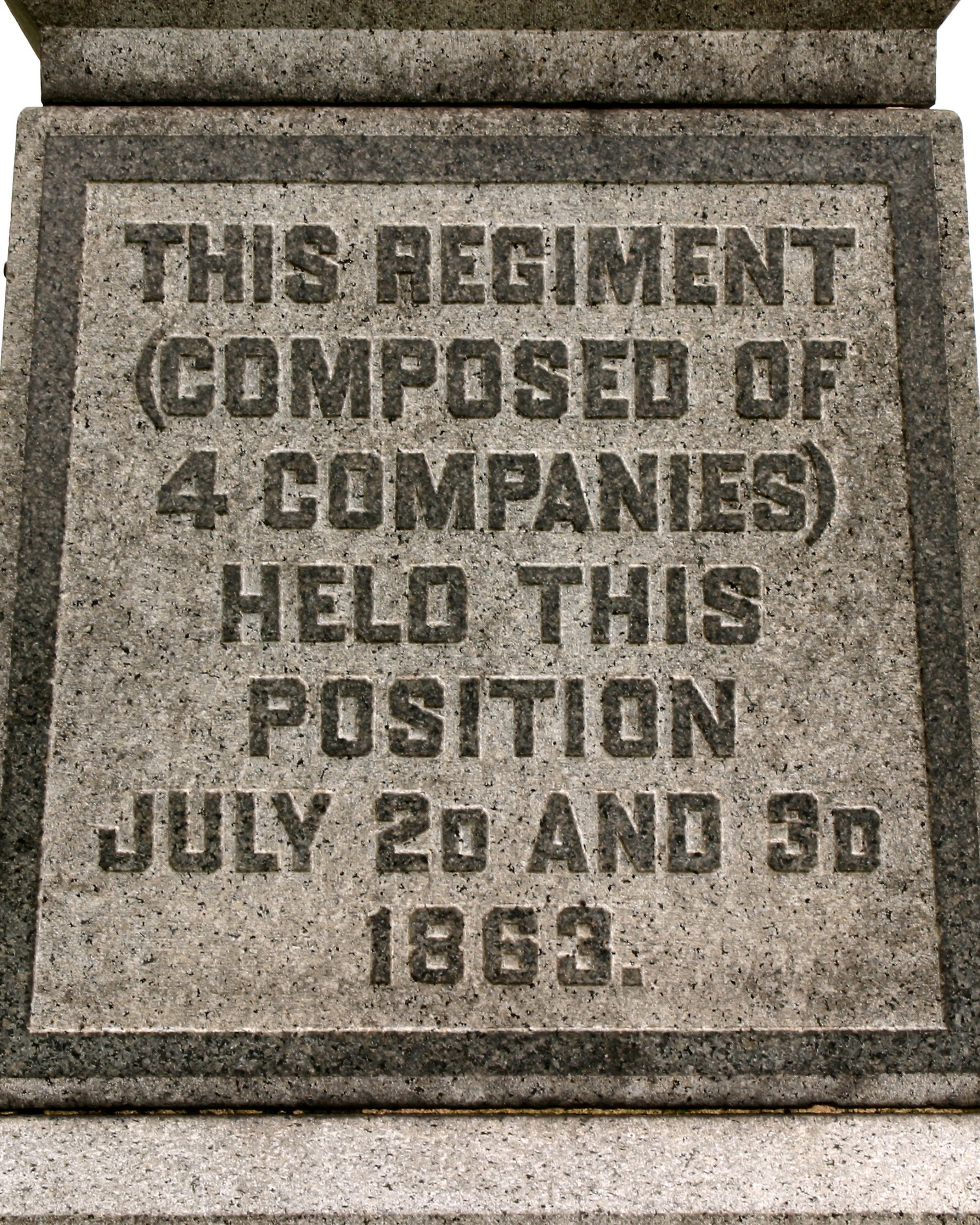 1 of 90 Monuments to New York. Indicates battle line position 39th NY Jul 2-3, 1863. Postion Marker located at area recaptured by Watson's US Battery. Mn located E side Hancock Av. Position Marker located in field. || MN, RF&LF Markers & Position marker. Mn: 3 part step base, fnd 7'sq. 4 Part shaft. Top: pryamid w/trefoil. All 20'H. Excised inscription 2nd shaft part w/bronze tablet reverse, bronze medallion in front. LF&RF: 1'sq x1'.
