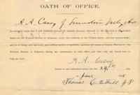 An aged slip of paper titled, "Oath of Office," with the signature of A. A. Casey dated June 24, 1895. Text reads: “I do solemnly swear that I will faithfully execute all lawful precepts, directed to the Marshal of the United States for the Western District of Arkansas, under the authority of the United States, and true returns make and in all things well and truly, and without malice or partiality, perform the duties of Deputy Marshal of the Western District of Arkansas during my continuance in said office, and take only my lawful fees, so help me god.”