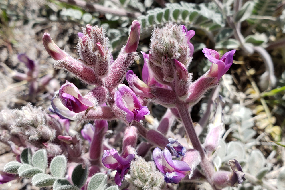 Woolly Locoweed (Astragalus mollissimus) has hairy leaves on often arching stems. The magenta to purple flowers are cupped around a light center, eventually becoming hairy curved pods.