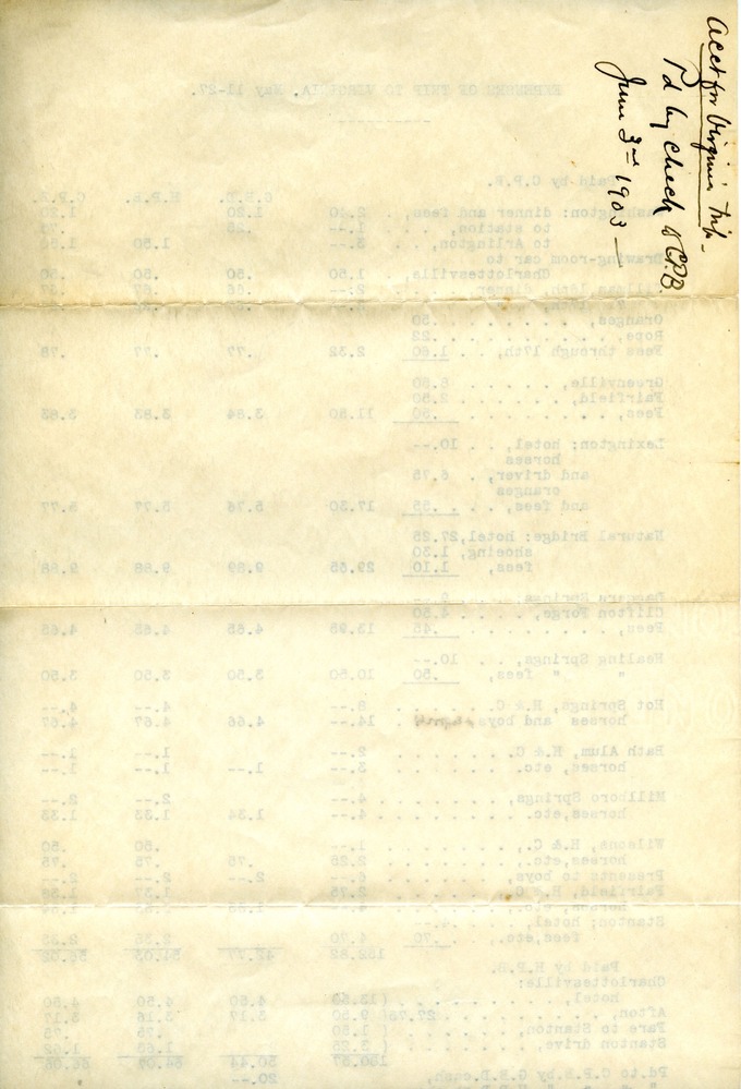Receipt for expenses accumulated during a trip to Virginia from May 11 to May 27. Expenses paid by C.P.B. and George B. Dorr. See following entries for continuation of sheet: "Receipt, Travel Expenses, June 3, 1903 p.1.tif" and "Receipt, Travel Expenses, June 3, 1903 p.2.tif"