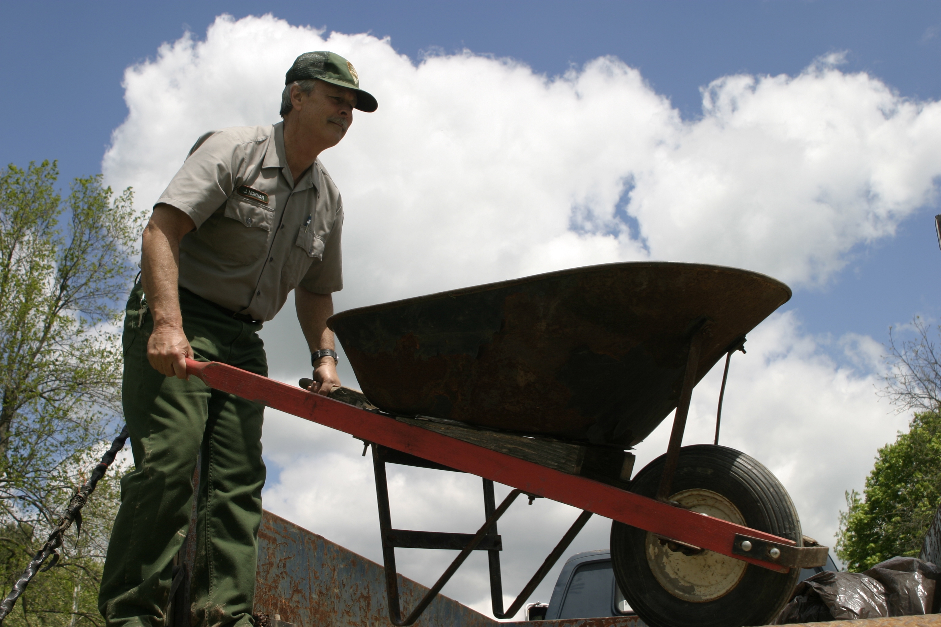 RiverDay is an an annual day of service and celebration in the Cuyahoga Watershed. Activities are coordinated by Friends of the Crooked River. Cuyahoga Valley National Park is a partner. Our volunteers remove trash from dump sites in several locations and invasive plants from the area around Howe Meadow. || NPS staff and volunteers load garbage and bagged invasive plants into dumpster on RiverDay.