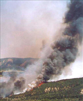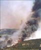 Intense burning with heavy gray and black smoke and flames during the Bircher fire, Mesa Verde National Park, July 2000