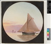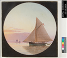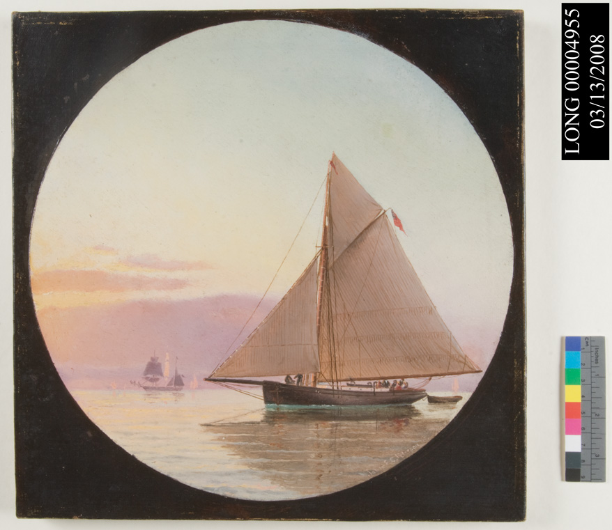 SQUARE SUPPORT W/ ROUND DESIGN RECTANGLE. LOW HORIZON, CALM WATERS W/ LARGE SCHOONER AT RIGHT, OTHER SCHOONERS ON HORIZON LINE. GOLD AND PINK SKY. SOLID BLACK PAINTED SPANDREL. UNFRAMED.<CR<CRMAY BE ONE OF PETERSEN PAINTINGS BELONGING TO CAL, LISTED IN THE "Appraisal of Estate of Mr. C.A. Longfellow".