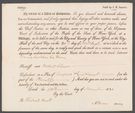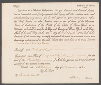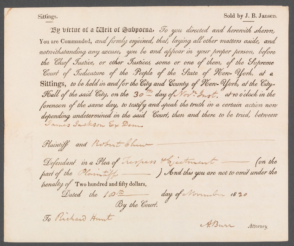 A subpoena to Richard Pell Hunt's father, Richard Hunt. On front of printed document: “Sittings. Sold by J.B. Jansen. By virtue of a writ of Subpoena To you directed and herewith shown, You are Commanded, and firmly enjoined, that, laying all other matters aside, and notwithstanding any excuse, you be and appear in your proper person, before the Chief Justice or other Justices, some or one of them, of the Supreme Court of Judicature of the People of the State of New York, at a Sittings, to be held in and for the City and County of New York, at the City Hall of the said City, on the 30th day of Novr Inst. At 10 o’clock in the forenoon of the same day, to testify and speak the truth in a certain action now depending undetermined in the said Court, then and there to be tried, between James Jackson, Ex dem Plaintiff and Robert Chew Defendant in a Plea of Trespass & Ejectment (on the part of the Plaintiff -----) And this you are not to omit under the penalty of Two hundred and fifty dollars, Dated the 10th ----- day of November 1820 By the Court. To Richard Hunt A.Burr Attorney.” On back of document: "To Richard Hunt"