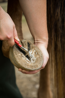 Mule hoofs are picked each morning. Removing dirt, small rocks, and other debris helps to maintain the health of the hoof and prevent illnesses.
