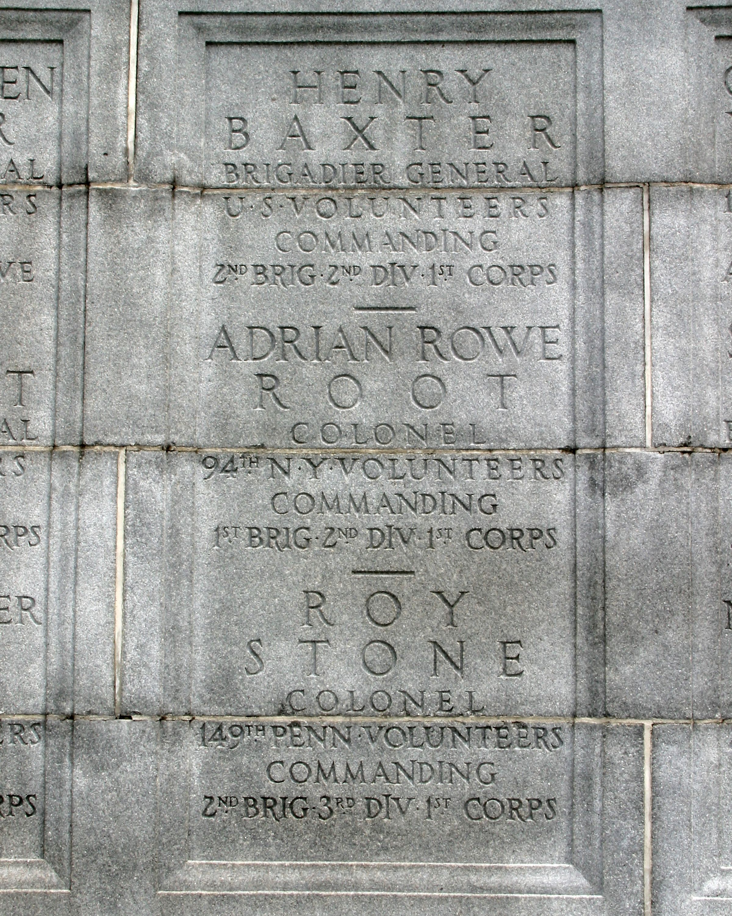 1 of 2 New York State Monuments. Erected to commerate NY commanders not listed elsewhere that fought at Gettysburg. Located E side South Hancock Avenue. || Mn, semi-circular 42'L x 24'D x 21' H. Central projecting node of base, shaft incised inscriptions, excised coat-of-arms, topped by spread wing eagle. Incised commander names in circular wall portions. Granite walk to Mn 8'x 14'w/2risers 8."