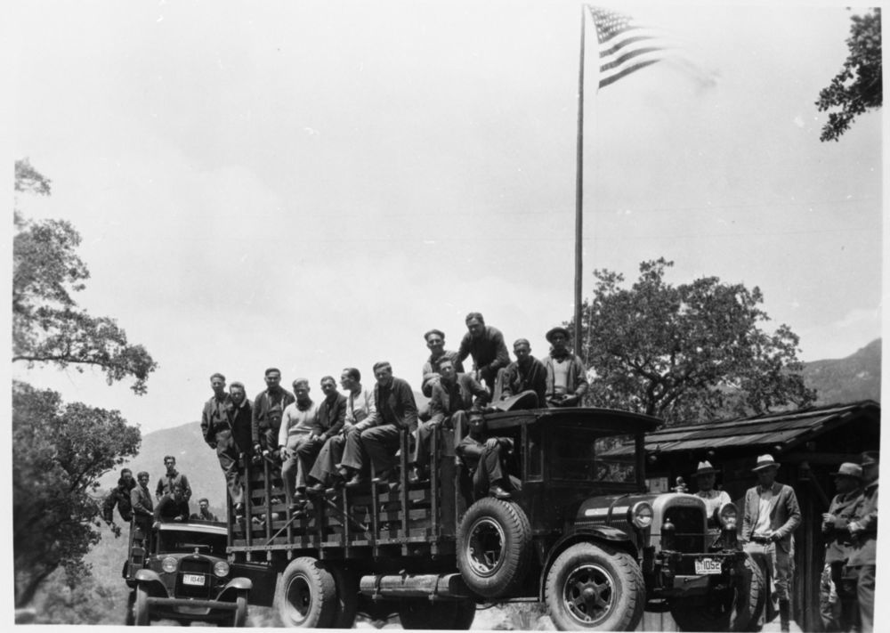 CCC Enrollees on trucks at entrance station. Vehicles & Equipment.