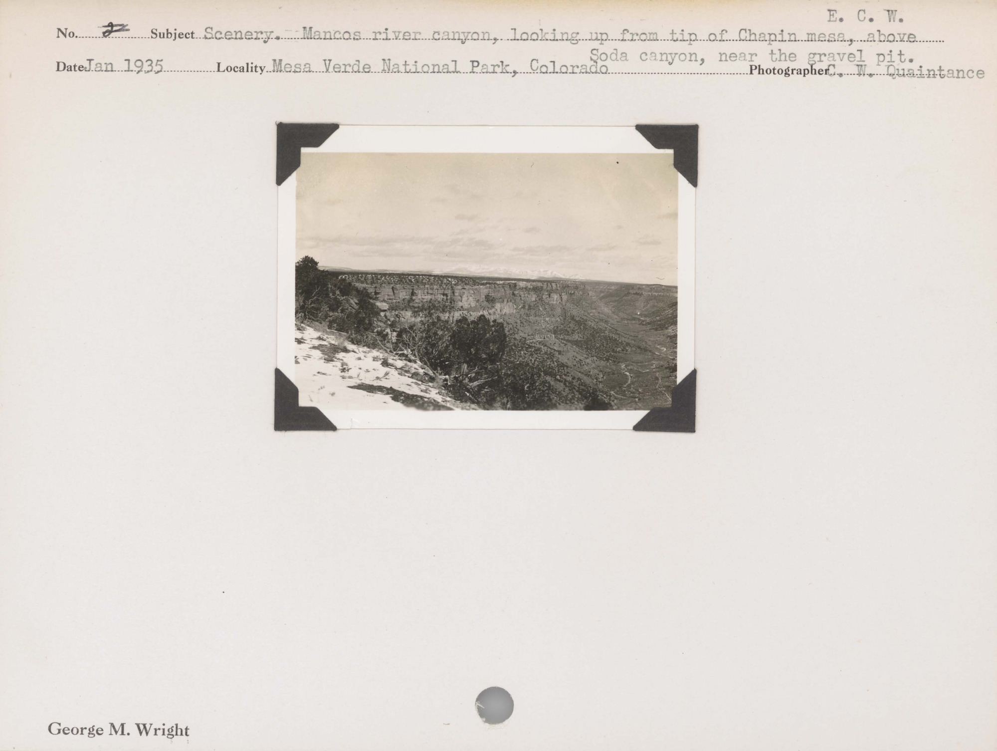 Scenery: Mancos River Canyon, looking up from tip of Chapin Mesa, above Soda Canyon, near the gravel pit. No negative on file. Locality: Mesa Verde National Park.