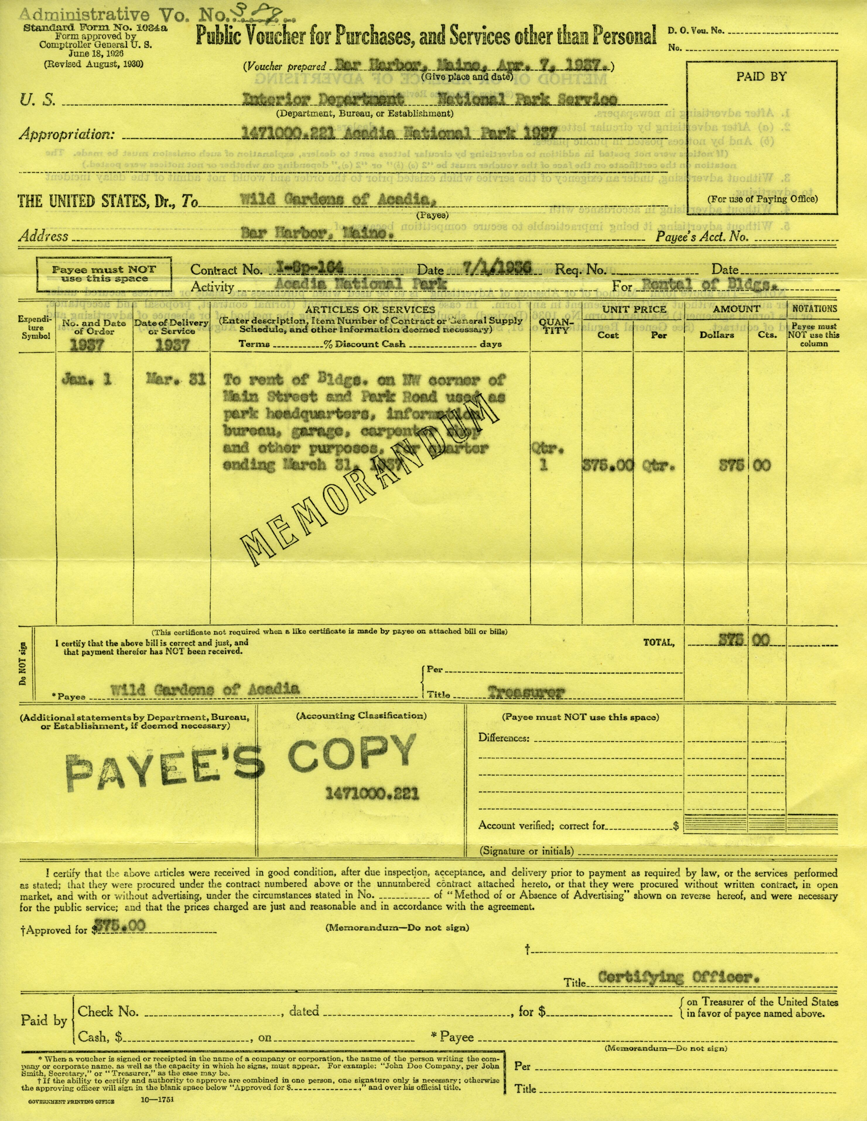 Receipt from Acadia National Park to Wild gardens of Acadia for the rental of buildings on the Northwest corner of Main Street and Park Road. These buildings were rented for use as park headquarters, information bureau, garage, carpenter shop and other purposes.