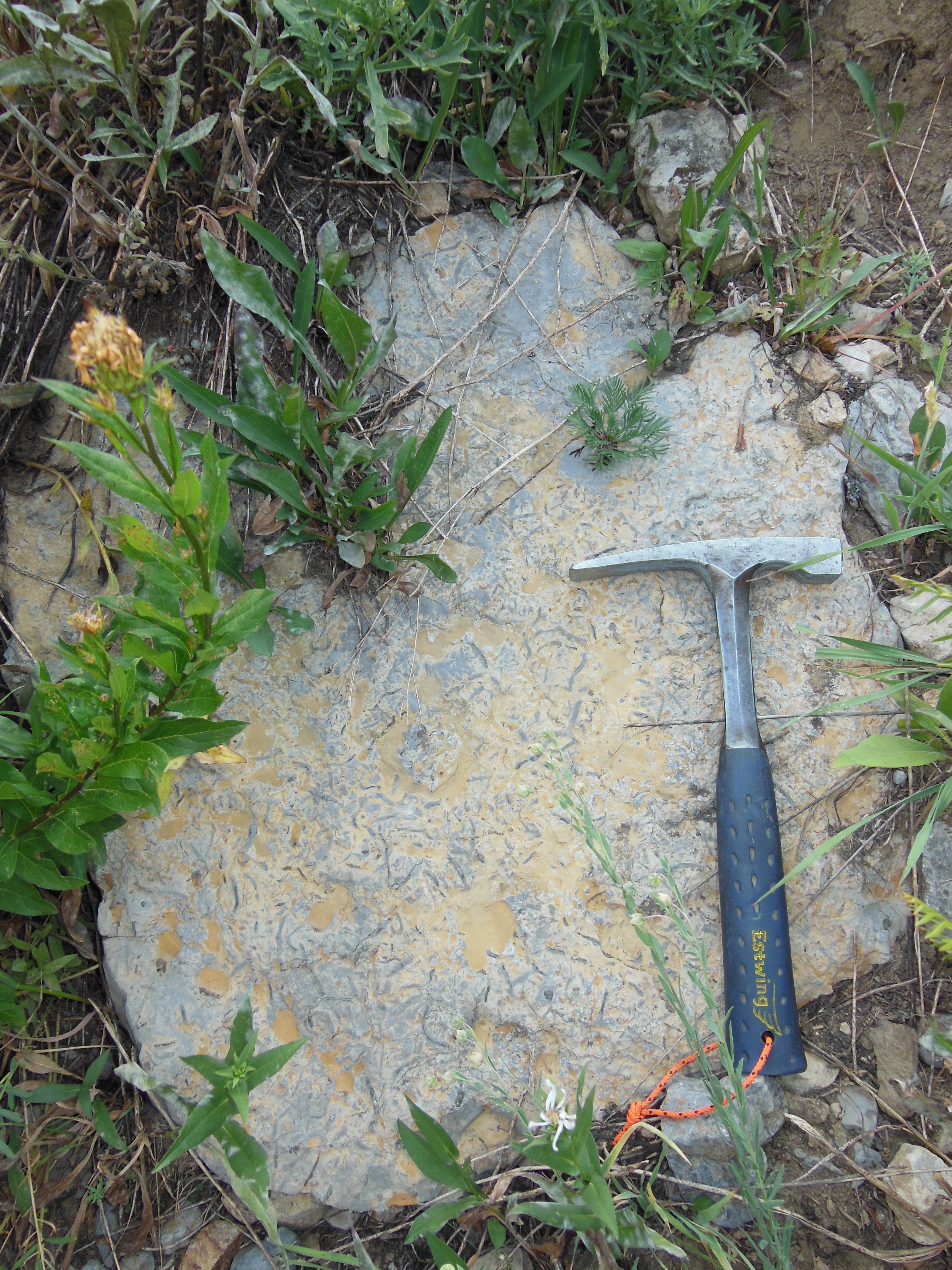 Fossilized burrows found in Death Canyon Shelf in 400Ma limestone at Grand Teton National Park, Wyoming.