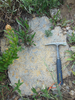 a slab of rock with impressions in it and a hammer leaning against it.