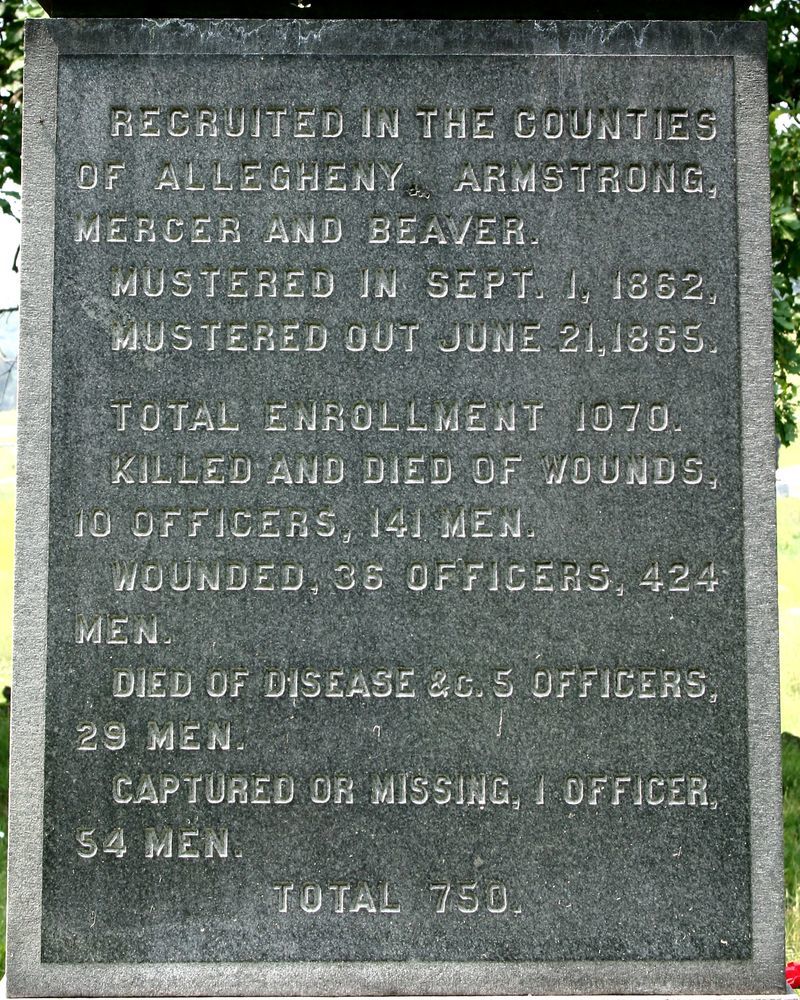Marks position held by 139th Pennsylvania Infantry from p.m. July 2, 1863 until close of battle. 1 of 110 mns in Park to Pennsyvania commands. Located S end of Althoff/Weikert Farm Lane, N of Wheatfield Rd. in Plum Run Valley. || Mn & 2 flank markers. Rough hewn base, 6'5"x5'4". Shaft 3'11"x2'10", 14'3" high. Inscriptions on polished panels. Relief of crossed flags & eagle, bronze State seal on W face. Relief of cross on all faces cap. Flank markers, flat topped, 1'x1'x1'6".