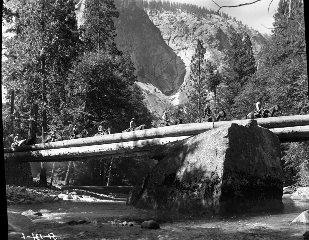 Stock Use, Bridges, old bridge across Kings River at Junction with Bubbs Creek Trail. Wirth, Merriam, Scoyen party.