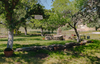 The area adjacent to Cesar and Helen Chavez's home that was used for regular communal gatherings and meals. Notice the sign hanging from a tree limb that reads "Helen's Park."