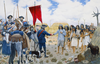 An illustration of the Anza expedition meeting a group of indigenous people at their village with a chicken, goat, dog, and huts