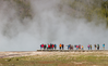 Dozens of people standing on boardwalk in front of a wide column of steam.