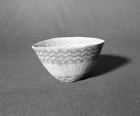 Marie Rozier Collection, Catalog No. 102. Object: Atsugewi basket. Wintu? Dimensions: 8" x 5". Materials: conifer root, bear grass, maidenhair fern stem. Technology: three bands of three strand twining at start similar to documented Wintu pieces; up to right slant of turns. Collection History: Alice Reade Collection. Photographed by Michael Dixon, December 1982. Catalogued by Craig Bates and Barbara Beroza. Yosemite Collections, National Park Service.