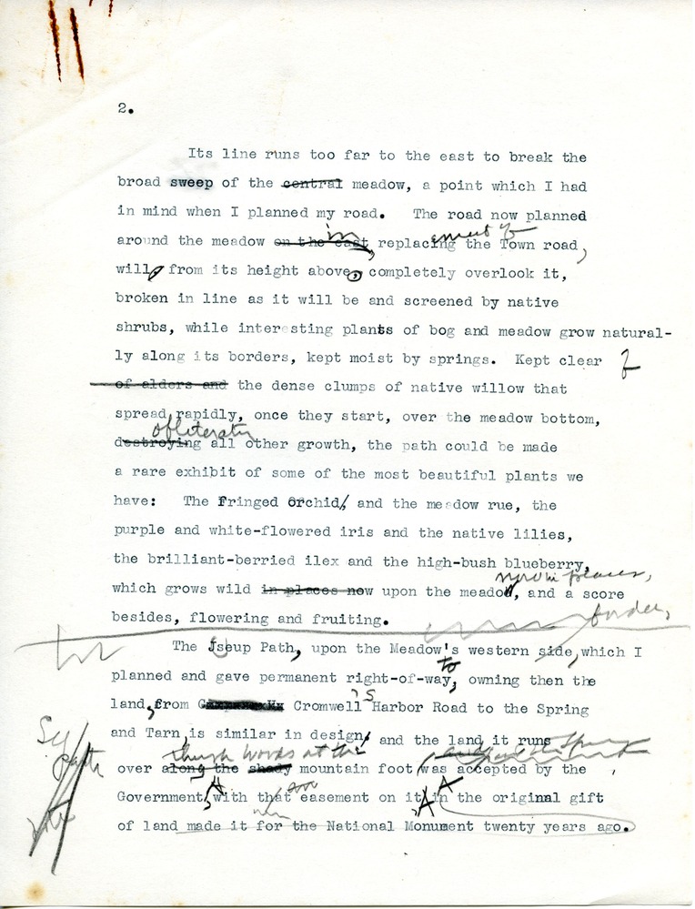 Draft correspondence discussing the Jesup Path right-of-way and its course. Includes mentions of Cromwell Harbor Road, Kebo Golf Course, Harden Farm Road, the Tarn, the Kane path, Sieur de Monts Spring, John D. Rockefeller. Includes handwritten notes and edits.