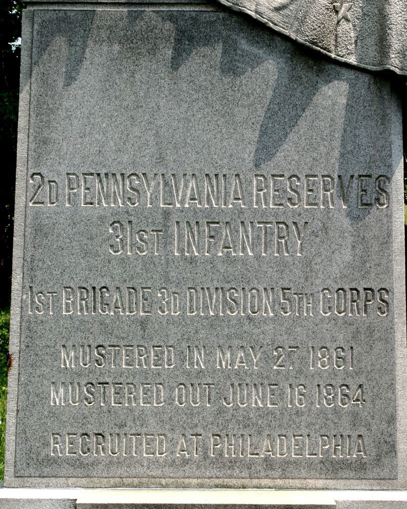 Marks position of 2nd Pennsylavania Reserves on July 2, 1863 after counterattack on advancing Confederates. 1 of 110 mns in Park to PA commands at Gettyburg. Located on E side of Ayres Ave on E edge of Wheatfield. || Mn & 2 flank markers. Rough hewn base, 5' sq. Shaft, 3' sq. Apex-cap topped w/ draped flag & V Corps Maltese Cross. All 9'3" high. Flank markers, apex topped, 1'x1'x8".