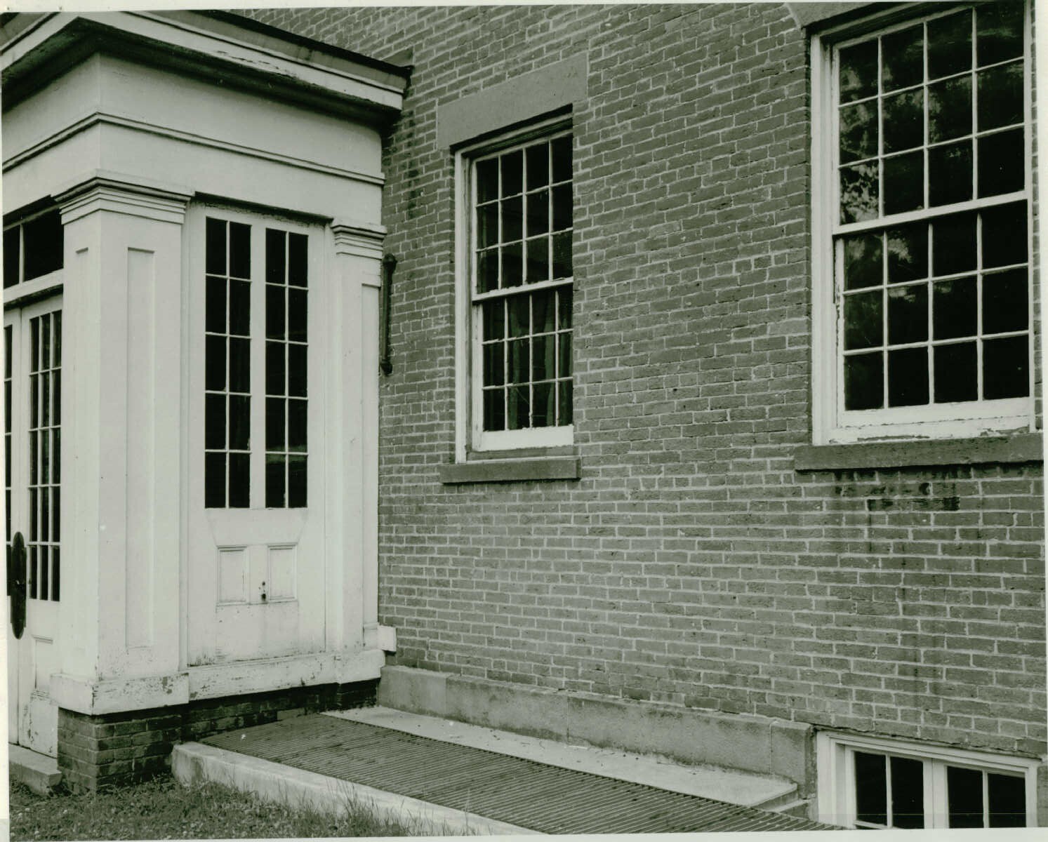 Black and white photo of a painted wooden vestibule entrance to a brick building taken from the right. A metal grate drain set in a concrete trough extends away from the side of the vestibule.