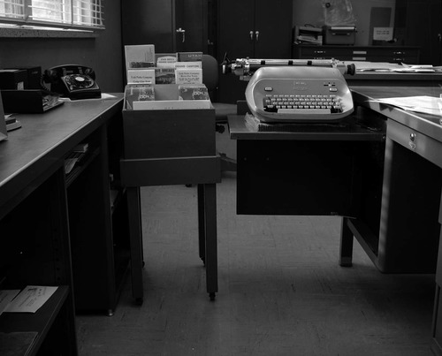 File cabinets improved by use of v-shaped block to hold file divider in place. Block suggested by Z. Brinkenhoff and made by J. Blackburn - for possible incentive award. ; ZION Museum and Archives Image 9707 ; ZION 9707