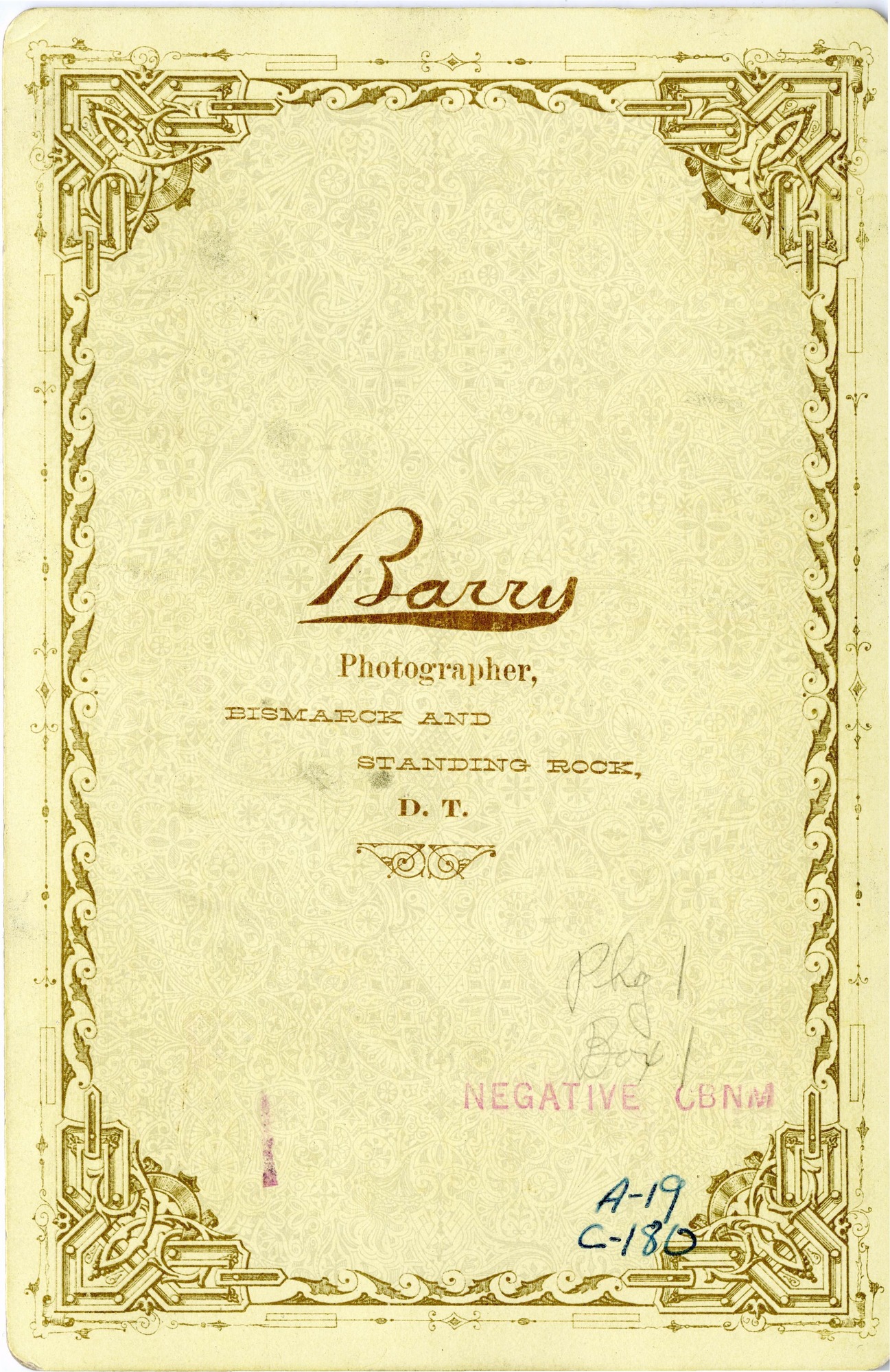 LIBI_00019_00180; This item is an albumen cabinet card (card-mounted photograph or studio portrait) of Standing Holy, daughter of Sitting Bull, wearing dentallium shell hair ties. The full view photograph is 4 x 5 3/4" (4 1/2 x 6 1/2" mounted) and was produced circa 1885 by David F. Barry. On the front, the typed notation on the card reads, "Standing Holy, (Sitting Bull's Daughter.) Copyrighted by D.F. Barry, 1885, Bismark, Dakota." The photographer's stamp is embossed in gold ink on the verso.Note: "Pkg 1/Box 1" handwritten on verso.; CABINET CARD [Card photograph]; Courtesy of the National Park Service, Little Bighorn Battlefield National Monument, LIBI_00019_00180, D. F. Barry, "Standing Holy, Daughter of Sitting Bull, with Dentallium Shell Hair Ties," circa 1885