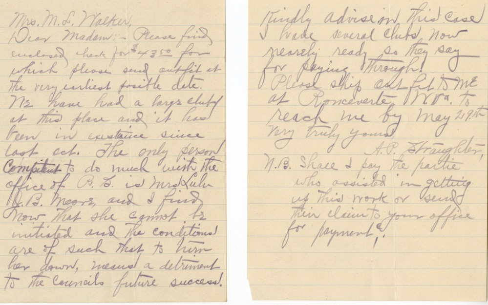 Accompanied a payment of $43.50 for an outfit requested to be sent to her in Ronceverte, West Virginia, by May 29th. She mentions that they have a large club and she is organizing a number of clubs. She also mentions that she had hoped that Lulu J.B. Moors would take on the position of "R.B." but for some reason she can not be initiated. She asks for Walker to advise her about this problem. This letter is numbered the same as other letters regarding Walker's work with the United Order of Tents. It is likely that this letter is also referring to the Tents though they are never mentioned by name and the letter is not dated.