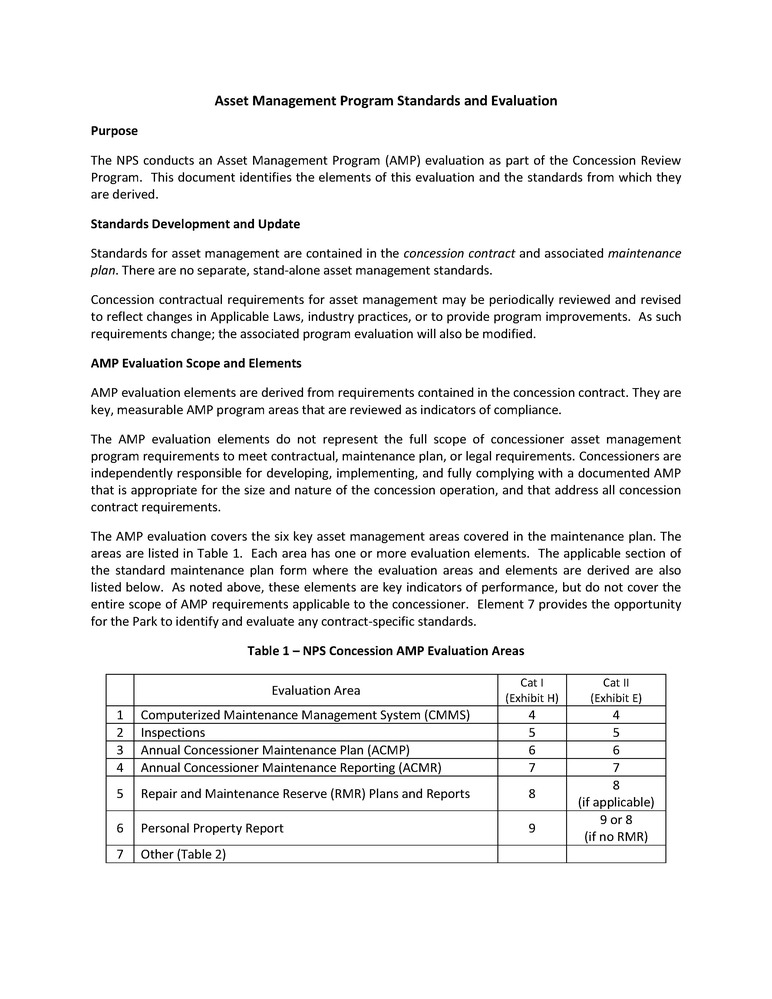 The NPS conducts an Asset Management Program (AMP) evaluation as part of the Concession Review Program.