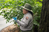 A park ranger points out an invasive plant along a trail.