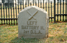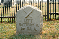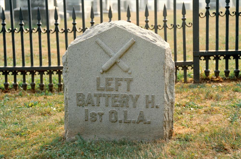 1 of 20 Mns to Ohio. Indicates position held by Battery July 2, 1863 around 4:00PM. In engagements on 2nd & 3rd July, 1863. Located in National Cemetery, E side upper Cemetery Drive. LF&RF located 65'&63' W-E of Mn, respectively. Flanked by 2 Cannon.