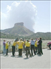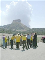 News media and park staff observe fire from a parking lot as a white smoke plume rises vertically over Long Mesa, Long Mesa Fire, Mesa Verde National Park, July-August 2002