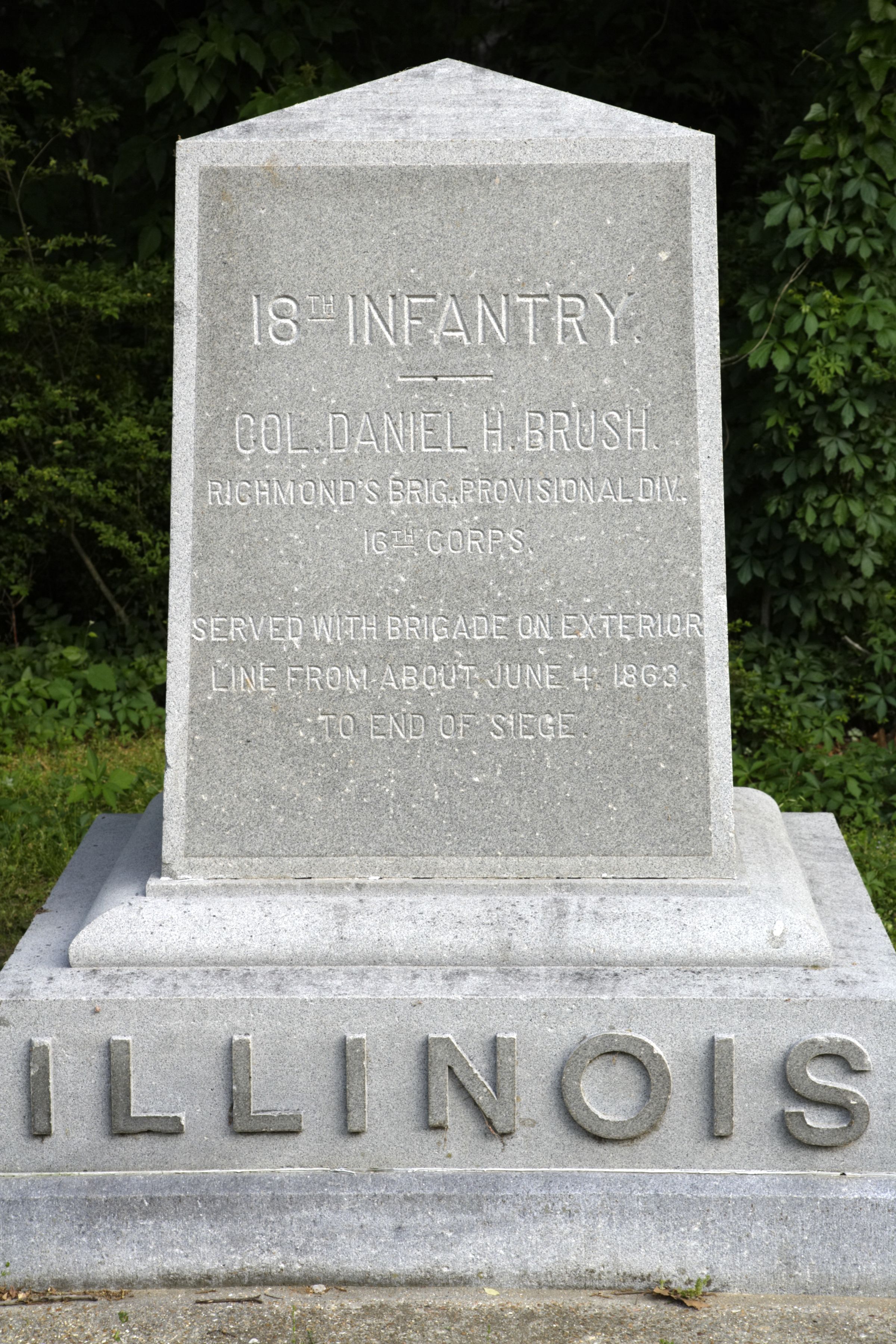5' x 4'2" x 6'6", gray granite monument has double step base supporting an obelisk. ILLINOIS is in raised polished letters on 2nd step; face of obelisk is polished and inscribed with unit designation, commanders, campaign record.