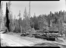 T. J. Hodgdon: Looking north up the Tioga Road towards Tuolumne Meadows. The log cabin in the foreground is Mr. Hodgdon's homestead cabin* (now relocated at the Wawona Pioneer History Center). The soldiers used it as a store house at the time of their guar