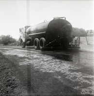 Side view of tanker truck spraying Kolob Canyon Road for chipsealing project. ; ZION Museum and Archives Image 002.12.06-5of20 ; ZION 15933