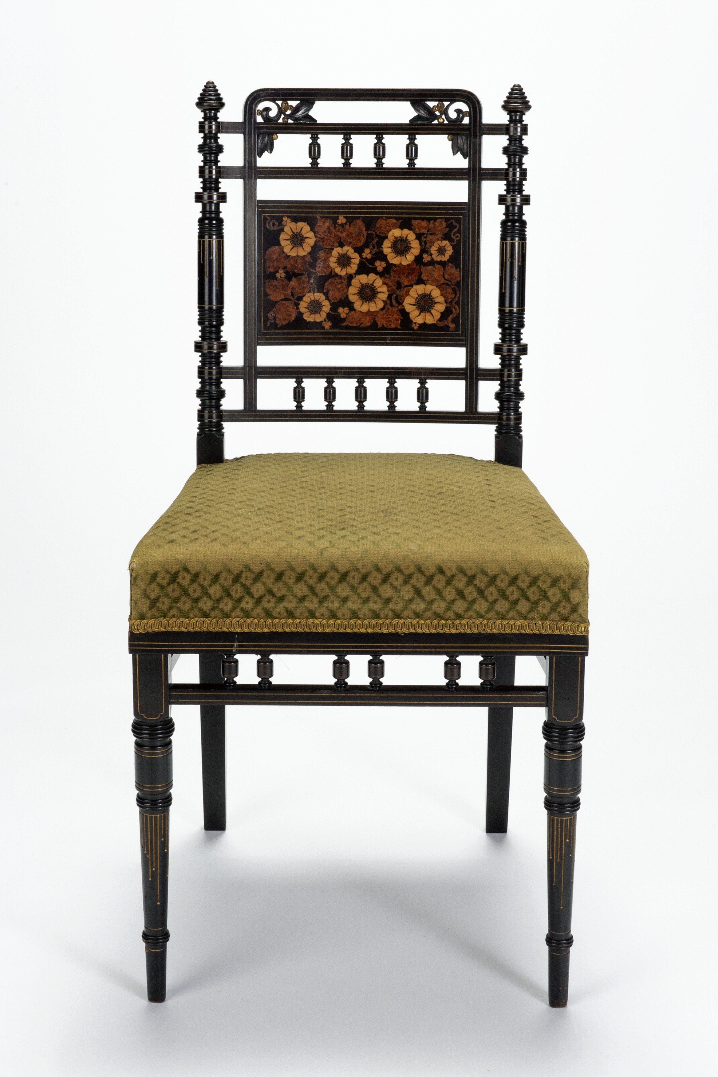 A wood side chair with ebonized finish, floral inlay, and upholstered seat.