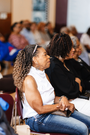 An older african american woman in a white blouse and jeans smiles softly while seated on a maroon plastic chair, surrounded by other african american audience memebers