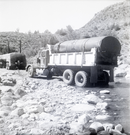 Side view of tanker truck spraying Kolob Canyon Road for chipsealing project. ; ZION Museum and Archives Image 002.12.06-5of20 ; ZION 15933