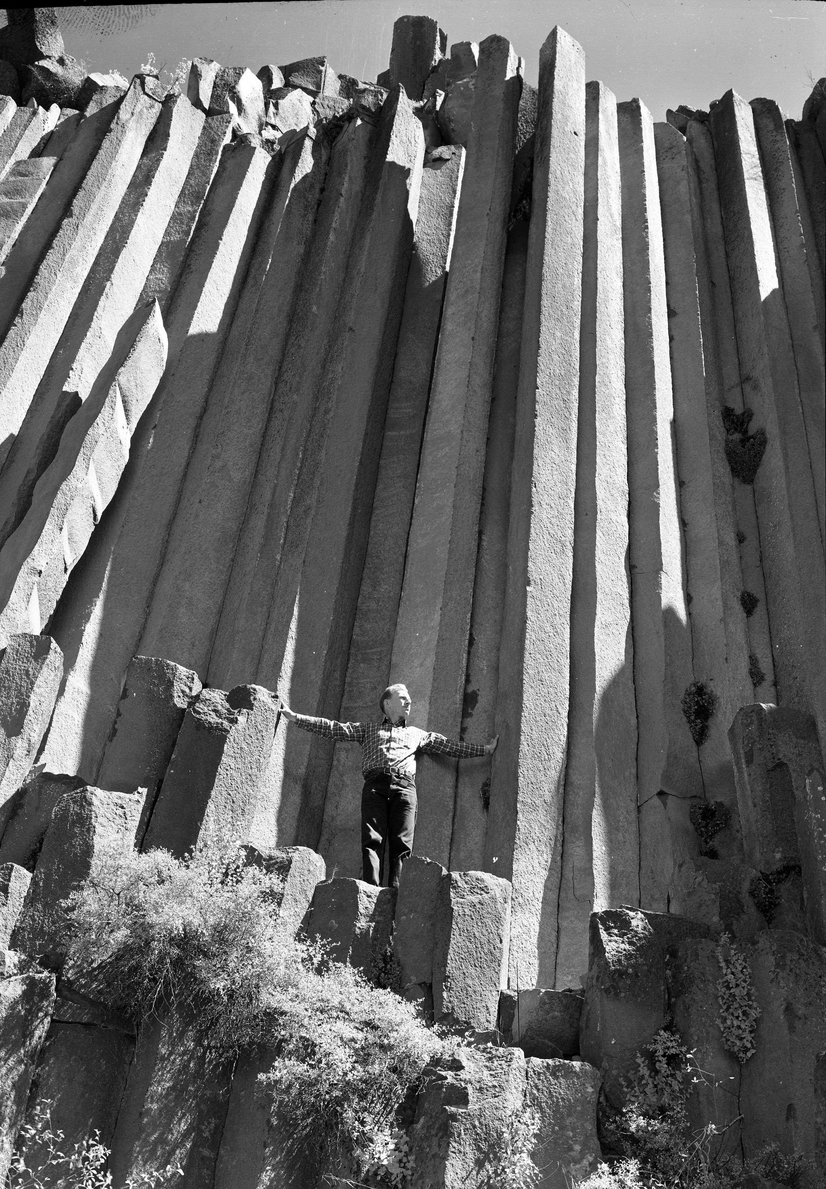 Palisades of Hexagonal Posts. Devils Postpile Nat. Monument. For geological views. Requested by Bryant on January 27, 1938. Photographed by Cather on January 28, 1938.