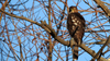 A mostly brown hawk is perched on a tree branch just right of center in the image. It's body is facing away from the camera, but its head is turned towards the camera. Behind it are several other tree branches and a blue clear sky.