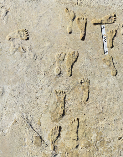 Aerial of at least two fossilized human footprint tracks. One pathway leads in a northern direction. Another track intersects and moves in an eastern direction. Length of footprints are contextualized using a ruler. 12 footprints in total.