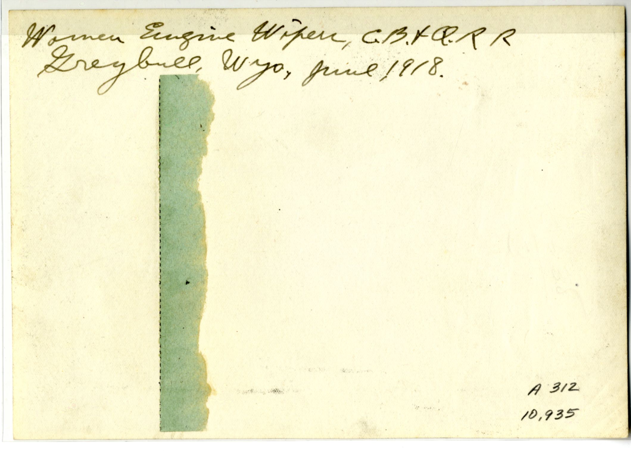 LIBI_00312_10935; Photograph in full length view, informal pose. The image depicts two women in cover-alls/jumpsuits and caps. They stand in the open doorway of a large wooden structure. Railroad car 3120 is visible in the background. The women work as engine wipers for the GB & QRR [Greater Burlington and Quincy Railroad?] in Greybull, Wyoming. Handwritten notation by Camp on the verso reads: “Women Engin Wipers, GB.+Q.R.R. Greybull, Wyo. June 1918. The image was taken by an unknown photographer on an unknown date. This may be the original image. ; photograph;Courtesy of the National Park Service, Little Bighorn Battlefield National Monument, LIBI_00312_10935, Unknown Photographer, "Women Engine Wipers in Greybull, Wyoming," June 1918.