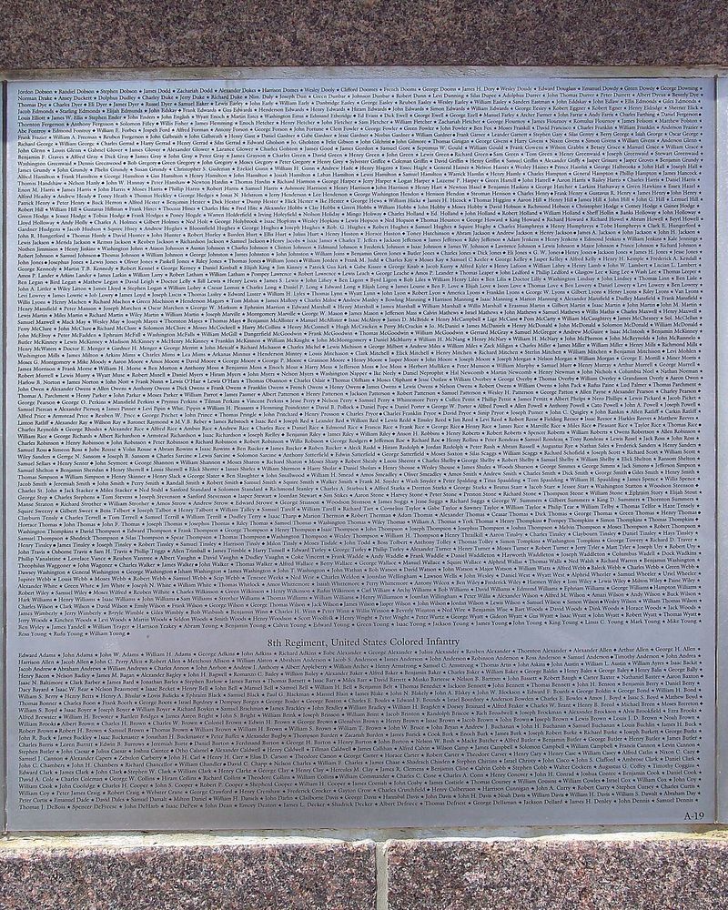 At the center of this monument is a metal sculpture surrounded on three sides by a "Wall of Honor," listing the names of 209,145 United Colored Troops on 166 burnished stainless steel plaques arranged by regiment. The plaques on this record memorialize the 8th Regiment, including the 8th Regiment, United States Colored Heavy Artillery (plaques A18, A19); and 8th Regiment, United States Colored Infantry (plaques A19, A20).